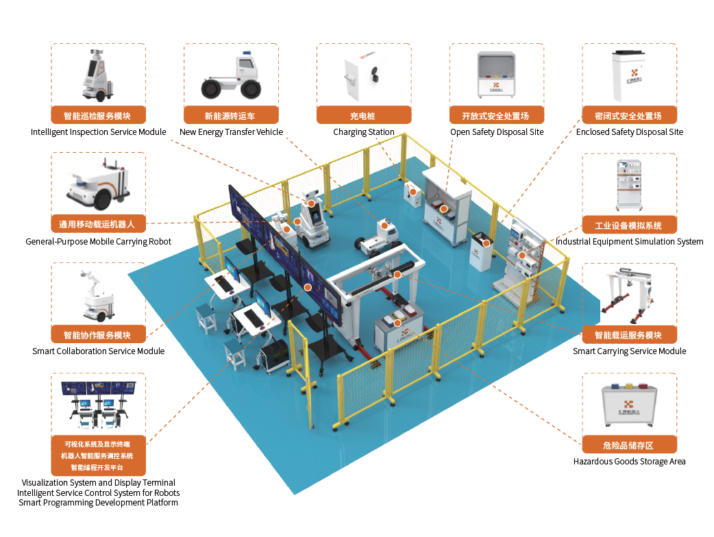 >系统融入服务机器人技术、物联网技术、5G+技术、数字化技术、多机器人协同等跨学科技术,借以提升对人工智能技术、服务机器人技术的综合应用能力,为尽快培养该领域知识性、复合型、技能型人才提供支撑。