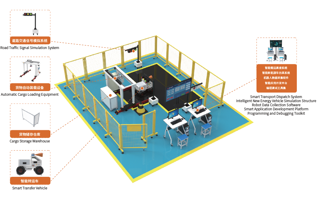 >系统体现道路交通信号、货物自动装载等多种典型应用场景,通过智能识别、运动控制、智能决策、人机交互、网络监控等服务功能模块的安装调试,形成与生产设备、工作环境、服务作业、运行管理等要素有效联接、协同运作;