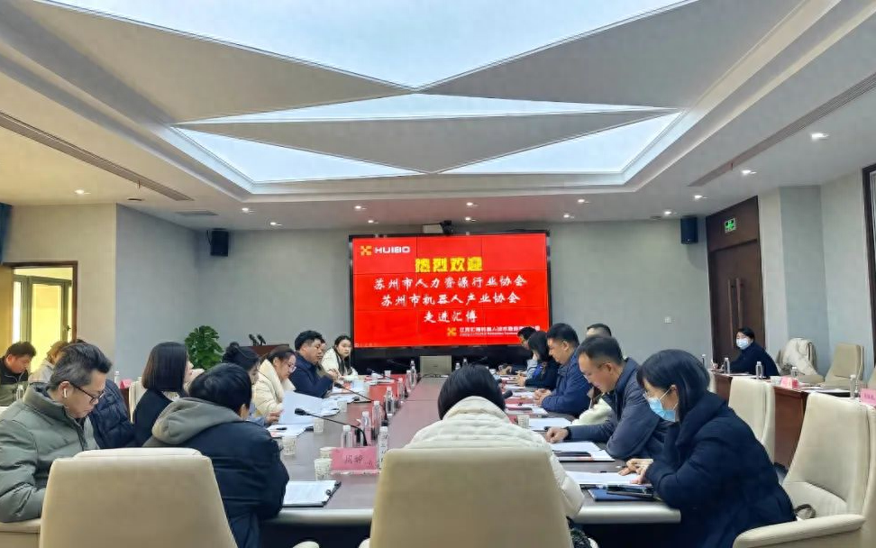 1月10日,苏州市机器人产业协会联合苏州市人力资源服务行业协会,组织双方30余家会员企业代表走进汇博机器人参观交流。汇博机器人副总裁涂强、政企事务部负责人热情接待,双方就共同探索产教融合新模式、拓展人才培养合作领域等方面展开探讨。