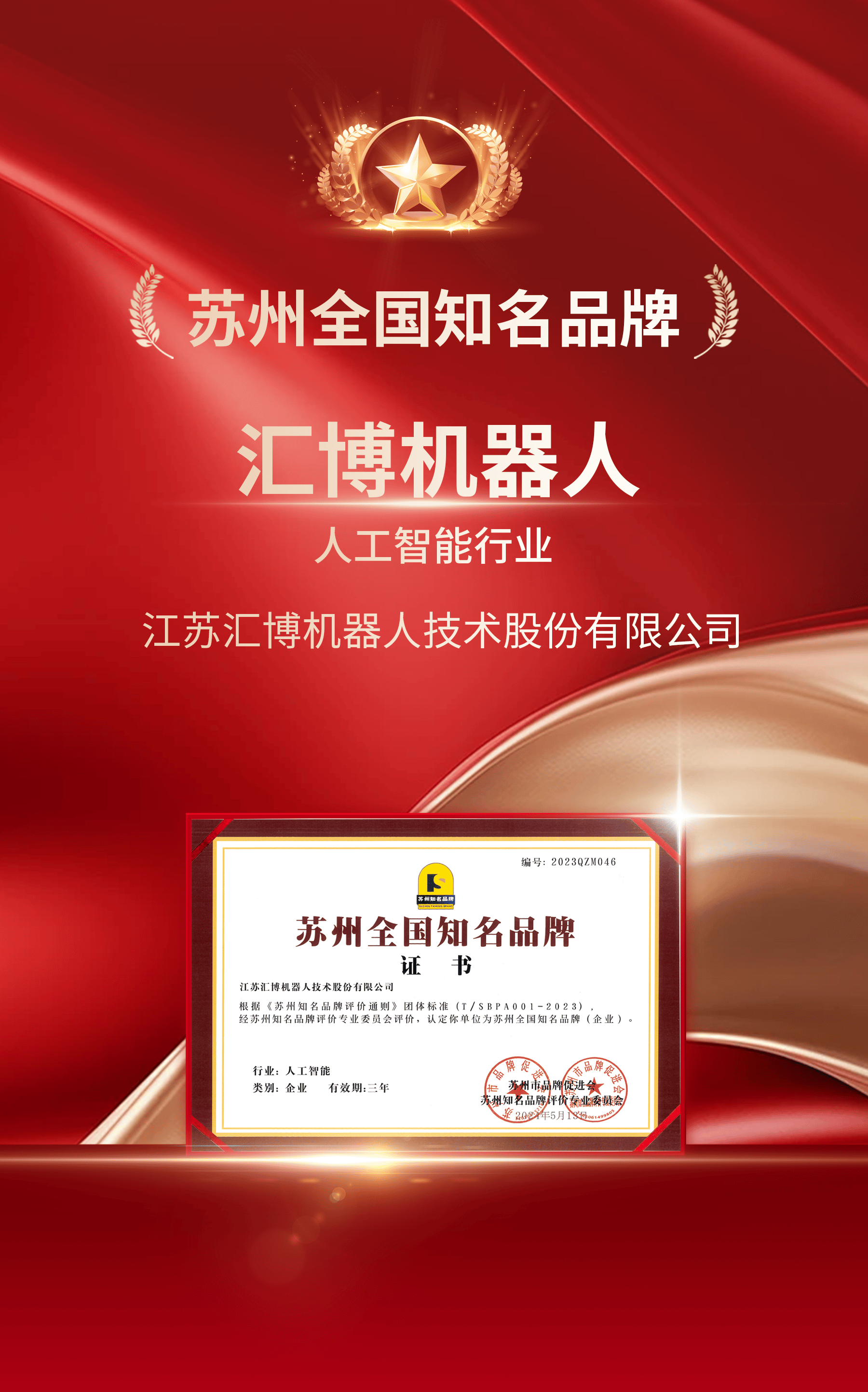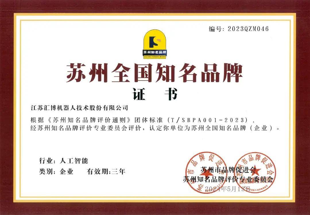5月13日,2024苏州新质生产力品牌论坛顺利举行。论坛上,苏州市品牌促进会苏州知名品牌评价专业委员会发布了“首批苏州知名品牌评价认定名单”,汇博机器人凭借在人工智能领域的创新应用,荣获首批“苏州全国知名品牌”认定。