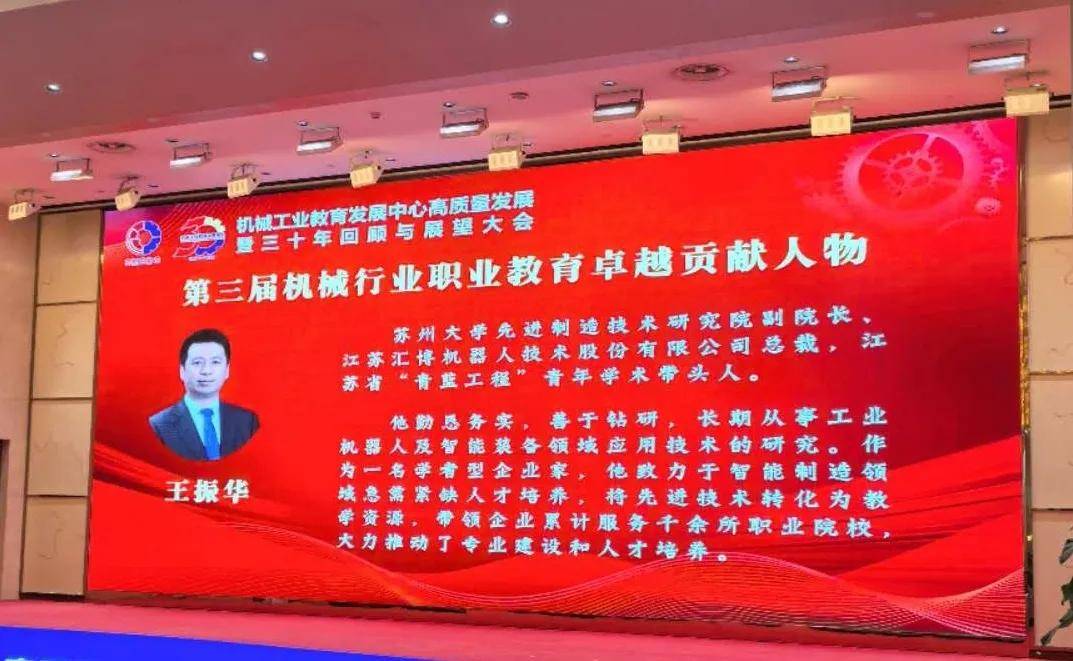 10月20日,机械工业教育发展中心高质量发展暨三十年回顾与展望大会在北京召开。会上,汇博机器人集团总裁王振华获评第三届“机械行业职业教育卓越贡献人物”。本次认定旨在传承机械行业“尊才重教”的优良传统,发挥机械行业先进典型人物的示范引领和榜样带头作用,引导机械行业职业教育在服务支撑制造强国建设、中国式现代化建设新征程中再立新功、再创佳绩。