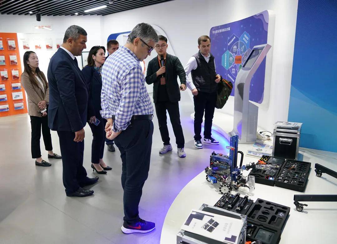 期间,嘉宾们参观了汇博机器人集团展厅及多功能实训区,深入了解了汇博机器人集团在机器人、智能制造、工业互联网、数字孪生等领域开发的数智应用技术,以及在高素质应用型人才培养和教学实训设备建设上的丰硕成果。