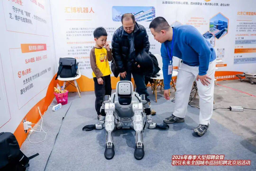 3月14日,2026年春季大型招聘会暨“职引未来——全国城市巡回招聘活动”在北京盛大启幕,北京汇博智能科技有限公司(以下简称“北京汇博”)携人工智能机器人领域新职业培育成果、沉浸式体验场景精彩亮相,以“技术链对接技能链”为核心,为求职者搭建新职业体验与就业对接平台,助力公共就业服务提质增效,为首都新质生产力发展输送高素质技能人才。