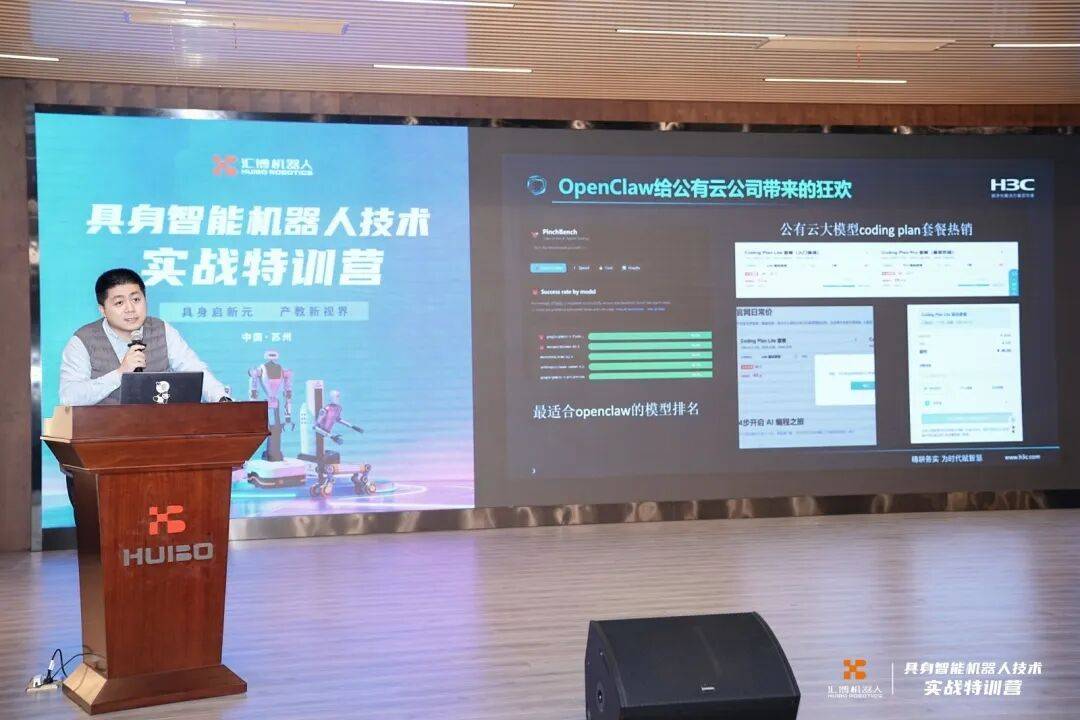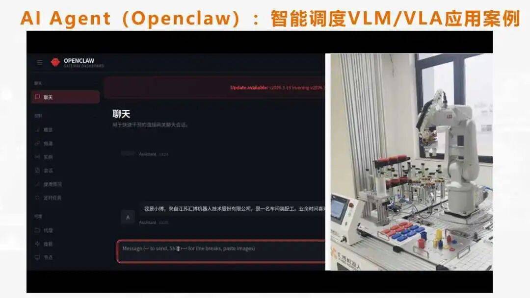 汇博机器人研发部总监许辉&产品与方案部副总监帅新宇从企业实践出发,系统解读具身智能核心技术,发布汇博具身智能专业教学整体解决方案,并展示了公司开发的基于OpenClaw智能体调度VLM/VLA模型控制机械臂运动的案例。