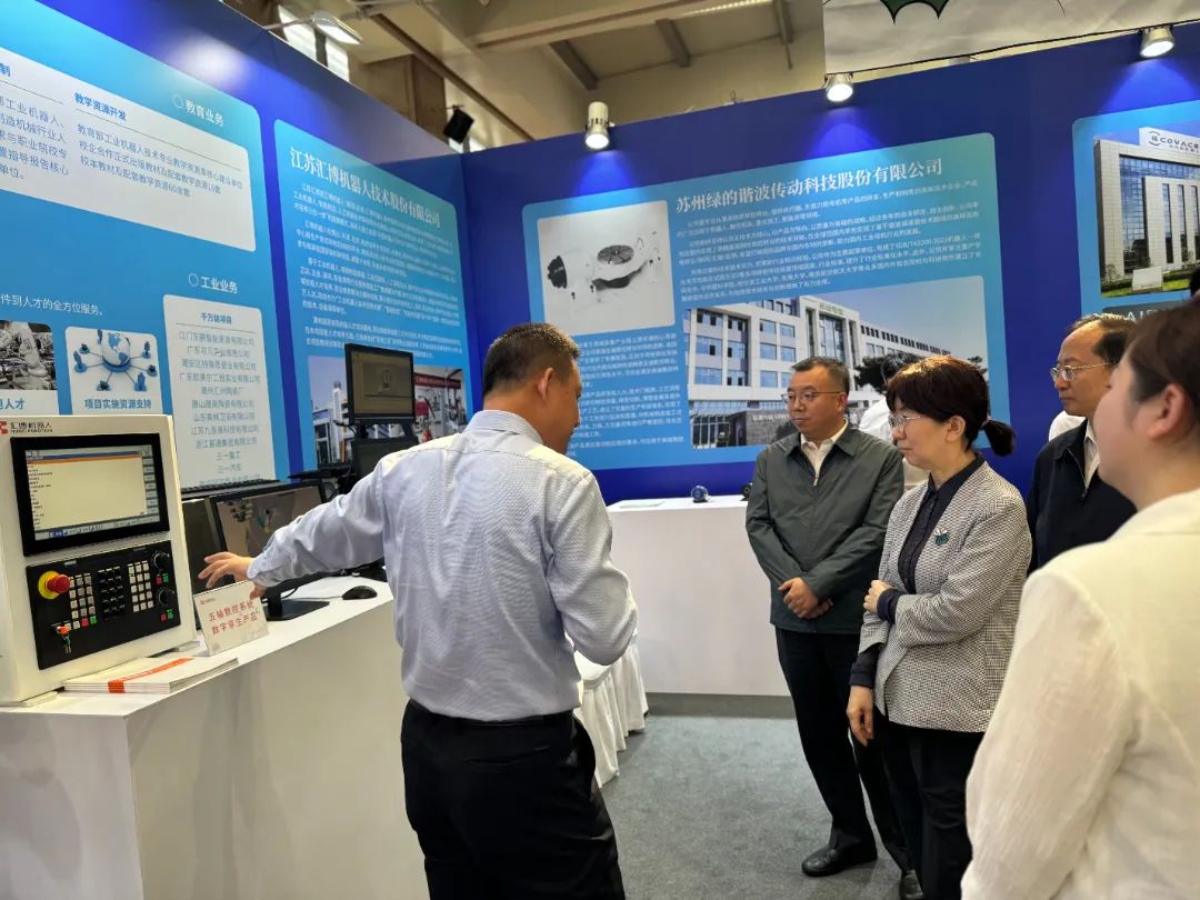 人力资源和社会保障部职业能力建设司副司长王晓君,江苏省人社厅副厅长顾潮,苏州市人民政府副市长查颖冬,苏州市人社局局长朱正等领导莅临汇博机器人展位参观指导,了解汇博机器人数字技能人才实训基地、数字技能技师工作室建设情况以及基于数字孪生技术的诸多技能人才实训方案。