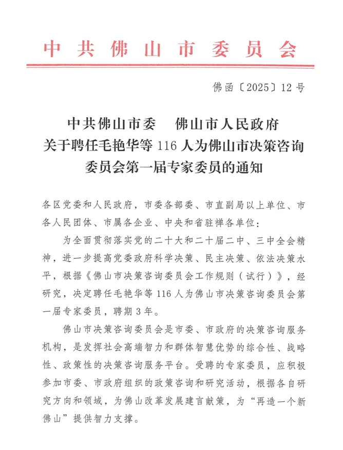 近日,中共佛山市委、佛山市人民政府印发《关于聘任毛艳华等116人为佛山市决策咨询委员会第一届专家委员的通知》(佛函〔2025〕12号),汇博机器人集团COO、广东汇博机器人技术有限公司总经理、正高级工程师秦磊受聘为“产业发展组”专家委员 。
