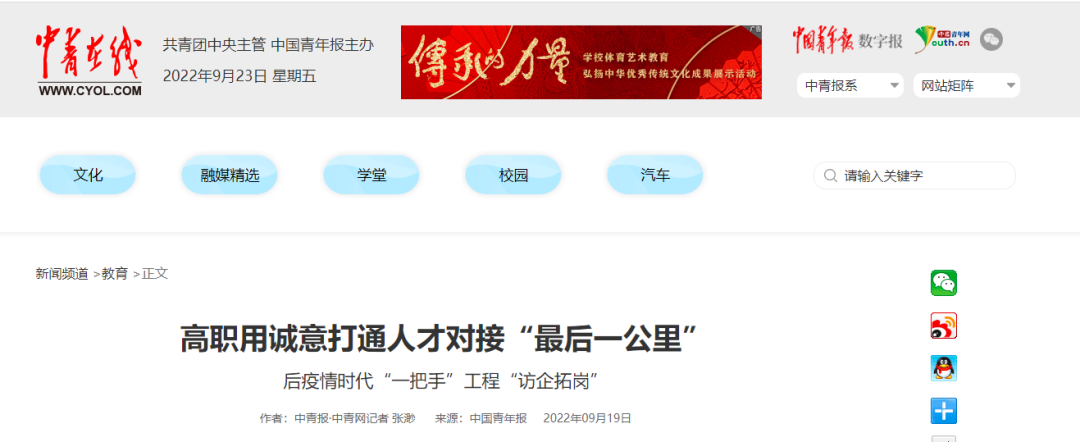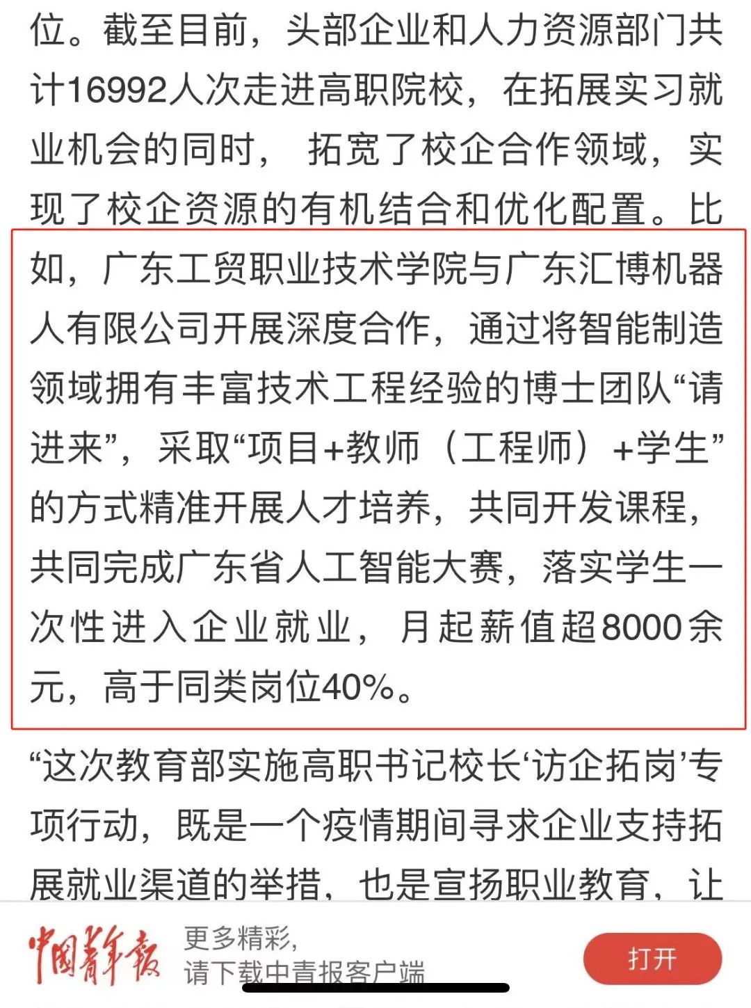 近日,汇博机器人与广东工贸职业技术学院作为校企深度合作的典型案例,共同走进《中国青年报》——“高职用诚意打通人才对接‘最后一公里’专题报道”。