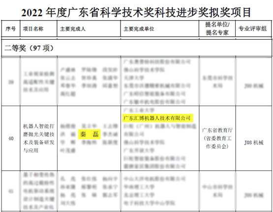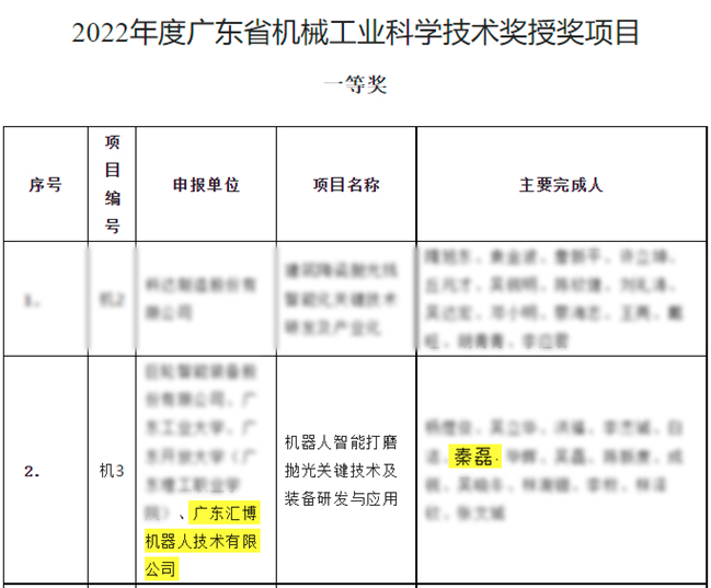 近日,广东省科学技术厅、广东省机械工程学会分别发布《2022年度广东省科学技术奖拟奖公示》、《2022年度广东省机械工业科学技术奖项目公告》,汇博机器人参与的 “机器人智能打磨抛光关键技术及装备研发与应用” 项目荣誉上榜,分别获评2022年度广东省科学技术奖之科技进步奖二等奖,2022年度广东省机械工业科学技术奖一等奖。